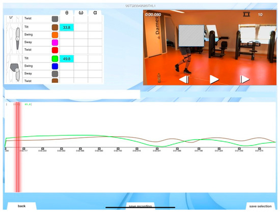 For the new 3D MoCap tool, custom-made software (SportsLapp, Factic BV, Enschede, The Netherlands) was used, analysing the collected kinematic data and converting it into real-time joint angle curves. Both the curves and the video footage are available simultaneously in the app (see Figure 2).