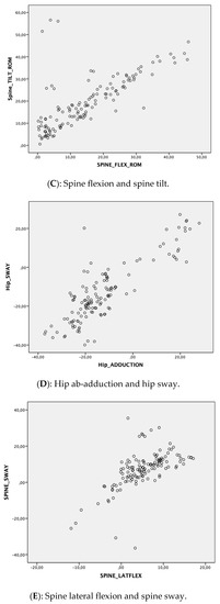 All sagittal plane measurement correlations observed were very strong for the knee and hip (r = 0.929–0.988, p < 0.001). For sagittal plane spine assessment, the correlations were moderate (r = 0.708–0.728, p < 0.001). Frontal plane measurement correlations were moderate in size for the hip (ρ = 0.646–0.818, p < 0.001) and spine (ρ = 0.613–0.827, p < 0.001). Correlation plots of all measurement data combined (3 single leg squat trials) are presented in Figure 4.