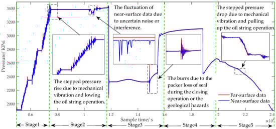 Moreover, some stage curves have similar characteristics with noise, which will make data processing more difficult. Figure 1 analyzes the characteristics of oil well-testing data. Generally, the complete well-testing operation process consists of five stage. The near-surface data are easy to transmit, but they are not as accurate as the far-surface data. In the waiting stage, because there is no downhole operation, the far-surface data remain stable and the pressure curve does not fluctuate too much. By contrast, the near-surface data in the same working stage have fluctuations due to uncertain noise or interference. These differences between near and far surface data are exactly what need to be removed in the filtering process. Meanwhile, the noises are mixed with real downhole geological pressure signals, which have similar characteristics with normal signal. Taking the stepped pressure rise as an example, even if the data characteristics are the same, the causes may be different, such as mechanical vibration, the operation of lowering the oil string, and the negligent use of oilfield workers. Similarly, there also exist burrs and stepped pressure due to the variations in downhole geological conditions and surface operation environment. If the data processing method is not appropriate, it will be very hard to identify whether the above similar characteristics is useful or not, and the useful signal will be easily filtered out as noise. Besides physical changes in the test well, the pressure gauge data acquisition system itself may pose a problem. In some cases, pressure data are stored with low precision, creating stepped change and noise []. All of the above situations bring much more uncertainty and ambiguity to the well-testing data processing.