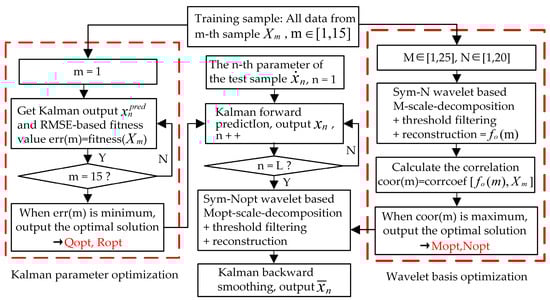 In view of weak real-time accurate data prediction and offline data analysis and interpretation capabilities due to the complex working conditions and the failure of engineering data denoising, a wavelet-based Kalman smoothing (WBKS) method to process uncertain downhole data was developed. This method combined the optimization of model parameters with data filtering and prediction, and adopted the technical route of multiscale decomposition, particle swarm optimization (PSO), Kalman prediction, and Kalman smoothing in turn. First, based on the measured downhole well-testing samples, take correlation as an index and optimize the decomposition scale and disappearance moment of the Symlets wavelet family through the iterative learning of training samples. Then, use PSO to find the optimal variance of Kalman prediction error and observation error. Finally, with the best optimization parameters, Kalman forward prediction and backward smoothing are sequentially performed on the testing samples to complete the entire processing. The flowchart of WBKS is shown in Figure 2.