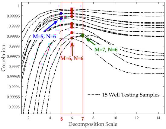 Figure 7 shows the distribution of the best decomposition scale when N = 6 and 15 oil well-testing samples obtaining the maximum correlation. When the decomposition scale was from 5 to 7, the correlation value was the highest, showing that the reconstruction coefficients obtained under these decomposition scales have a good ability to restore data.