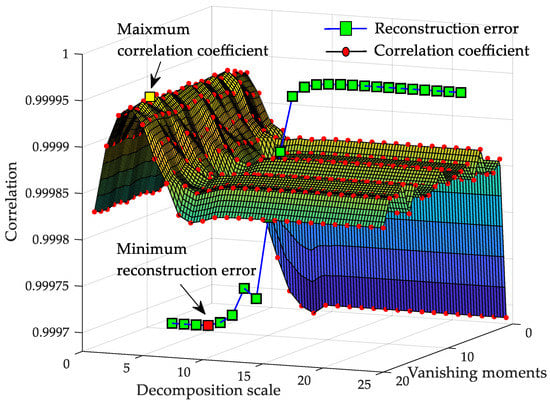 In addition, the vanishing moment M is related to the degree of energy concentration and the degree of compression of wavelet coefficients after wavelet transformation. The decomposition scale N reflects the overall approximate characteristics and the details of the signal. Here, we used correlation and mean square deviation as indicators, and chose the parameters M and N with large variance fluctuations (showing that the filtering effect is good) and small average error and mean fluctuations (showing that the reconstructed data are closer to the original data) as the optimal parameters, denoting them as and .