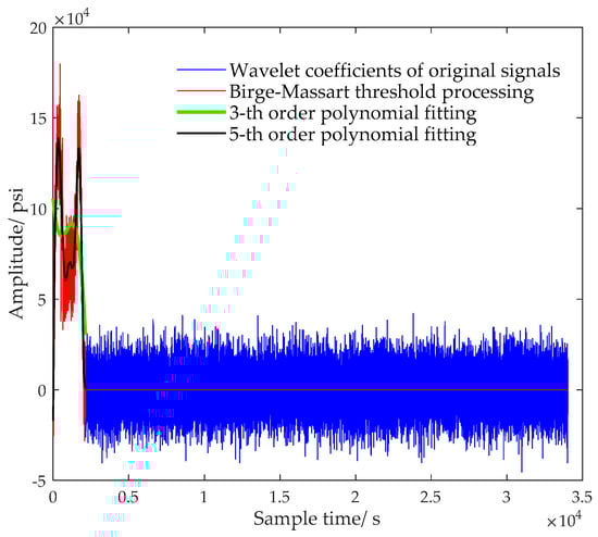 Figure 9 reflects the distribution of wavelet coefficients when different reconstruction methods were used. In it, the number of the obtained coefficients varied with different methods; there were 34,093 original wavelet coefficients, 2135 threshold coefficients after forced denoising, and 20 coefficients after the 3-th or the 5-th order polynomial fitting and quadratic wavelet reconstruction. The 5-th order polynomial could well characterize the trend of wavelet characteristics, while the data reconstructed by the 3-th order polynomial had a large deviation from the original data. Here, being an example, the 5-th order polynomial fitting was put forward just for illustrating the feasibility of fast data compression. The optimal order of the polynomial was not determined and should be flexibly adjusted according to the memory size and production accuracy requirements.