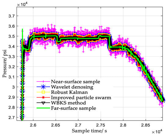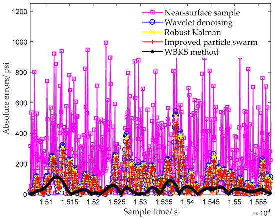 Figure 10 and Figure 11 took the far-surface data as the standard data, compared the filtering effect and absolute error on the near-surface data of the fourth sample after using different processing methods. The wavelet denoising method sequentially performed sym6-based 6-scale wavelet decomposition, coefficient soft threshold processing, and coefficient reconstruction. The classical robust Kalman method used Formula (6) to calculate the filter outputs, and its Q and R were random values. The improved particle swarm algorithm, on the basis of the classical Kalman method, added the optimization of Q and R by PSO. It can be seen from Figure 10 that due to random interference and mechanical vibration, the near-surface sample contained a lot of burrs before being processed by other methods, resulting in the data having poor resolution and high absolute error. From the processing results of near-surface data, we know that the filtering capabilities and the abilities to restore the true pressure trend of different methods were different. Among all the processed data, the data processed by the WBKS method were closest to the real far-surface data, and its absolute error was also the smallest.
