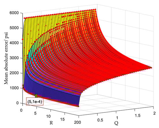 In order to intuitively show the position of the optimal parameters obtained using PSO in all parameters, we took the same fourth sample as the analysis object and used the traversal method to plot the average absolute error distribution under different Q and R values. and , the traversal steps of Q and R, were 0.05 and 0.1, respectively. The experimental results in Figure 12 show that the obtained optimal parameters were and .