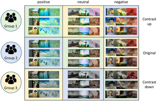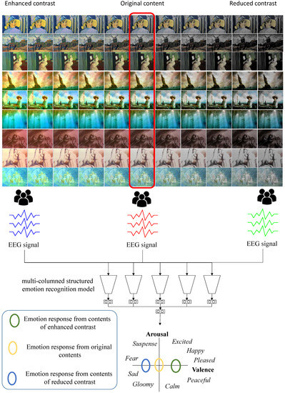 To reveal the relationship between the contrast and emotional response, we collect some scenes from various visual contents of three representative emotions: neutral, positive and negative. Then, we control the contrast of the scenes in both directions, either enhancing or reducing. For each scene manipulated, we employ human participants to appreciate the contents, while their EEG biosignals are captured and processed using a deep learning-based emotion recognition model. We prove that the contrast change of a visual contents affect the arousal or valence estimated from the emotion recognition model. The overview of our framework is illustrated in Figure 1.