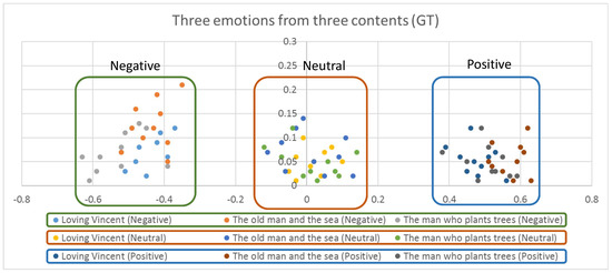 Ground truth emotions estimated from the clips sampled from the three contents.
