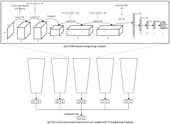 We implemented our model in a personal computer with Intel Core i7 9600 CPU (Intel, San Jose, CA, USA), 16 GB main memory, and nVidia GeForce TitanX GPU (nVidia, Santa Clara, CA, USA). The model is implemented using Python with Pytorch library. Our multi-column structured emotion recognition model was derived from our previous research [13]. The structure of our emotion recognition model is illustrated in Figure 6. In this work, we build our recognition model with five recognizing modules, since Yang et al. revealed that five modules showed the best performance in recognizing emotion.