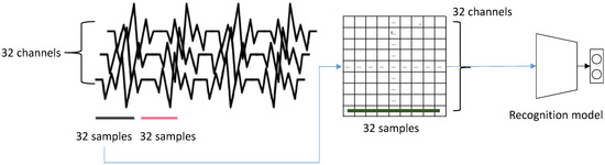 We followed the data collection strategy in [13]. For a training, we downsampled the EEG signals of DEAP dataset to 128 Hz and applied a 4.0–4.5 Hz band pass filter. As a result, we sampled samples from each trial for 40 channels. Among them, we excluded eight channels for the normalization. 32 channels of EEG signal became one row of our 2D input. Therefore, we sampled 32 consecutive samples from a single input for our model. Figure 7 illustrates the construction of a single input data. For a test, we similarly built input data using the EEG signals captured from participants.