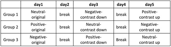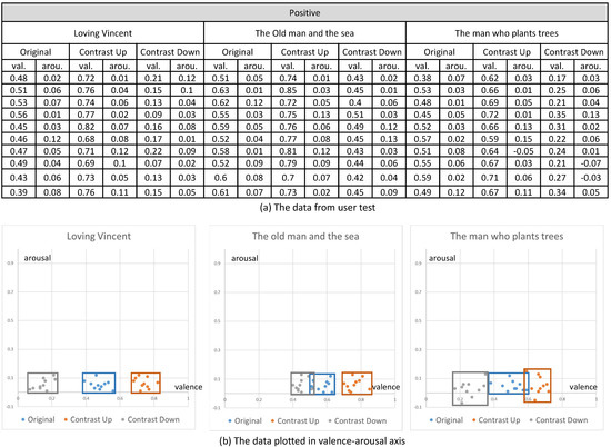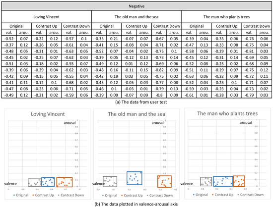 Similarly, in Figure 17, the emotion due to contrast up from originally negative emotion was enhanced, which was recognized in the increase of valence. In this case, the valence enhanced from the negative emotion was still less than the valence of neutral emotion.