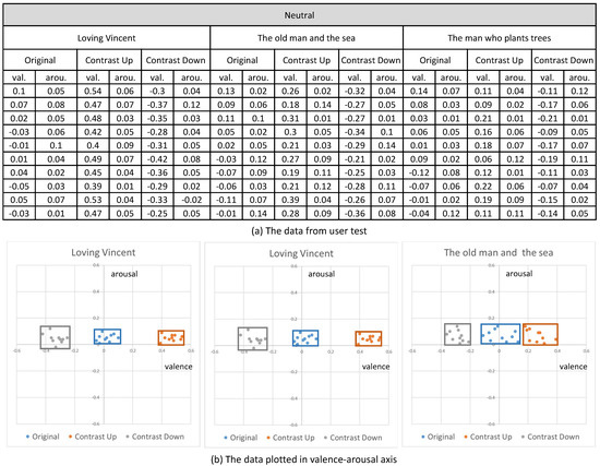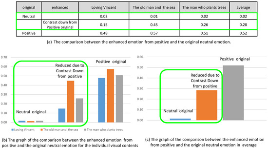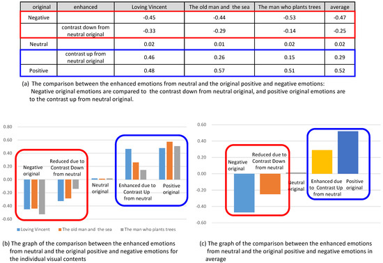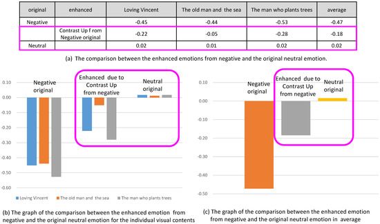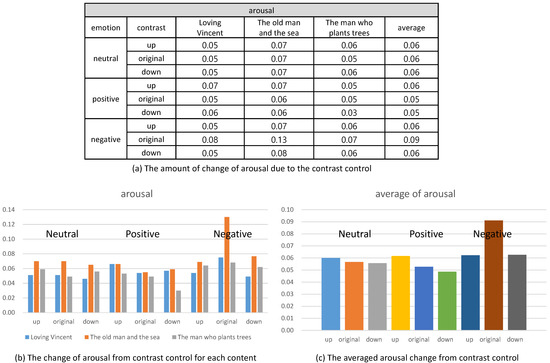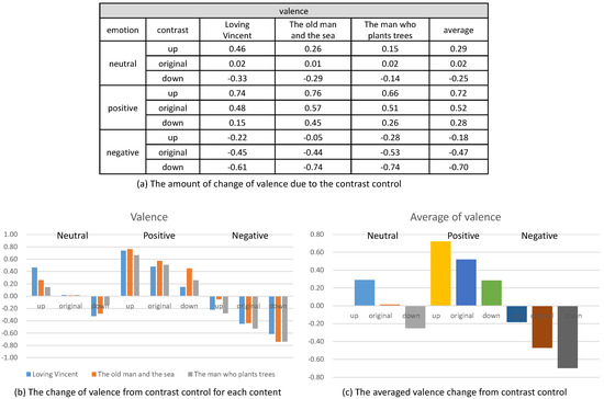 In this analysis, we compared the enhanced valence from the control of contrast to the valence of original contents. In Figure 15, the enhanced valence and reduced valence from the contents of originally neutral state were compared with the valence from the original positive and the original negative, respectively. Figure 15b shows the comparison for three contents and Figure 15c shows the comparison for the averaged valence from the three contents. In the graphs, we concluded that the enhanced or reduced amount of the valence did not reach the valence of original contents. For example, the valence from the originally neutral emotion was enhanced due to the contrast up, while the amount of the increased valence did not reach the valence of originally positive emotion.