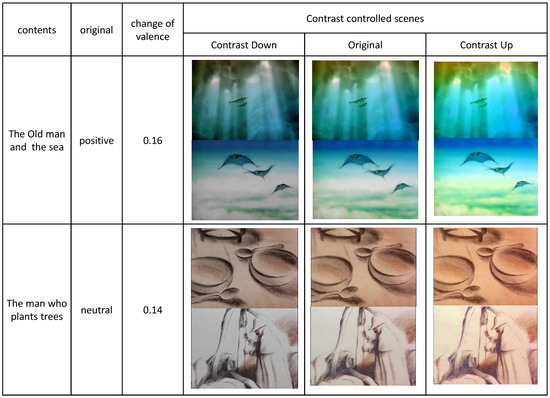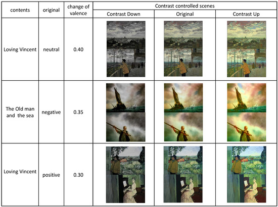 We selected three well-known animations for our study: Loving Vincent [29], The old man and the sea [30], and A man who plants trees [31]. These animations are recognized as distinctive rendering styles. We selected the artistically styled contents, since we concentrated on the color variation of the contents. Since the color variation of artistic styled image was narrower than that of real photograph, the effect of contrast control could be more drastic for artistic styled images. Therefore, the effect of contrast control on artistically styled images for emotion variation could be more dominant than that on real photographs. We will extend the target visual contents to real photographs in future work.