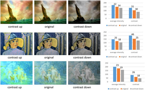 An unexpected result of our contrast control scheme is that the intensity of the image also varies. Enhancing the contrast may increase the average intensity of the image and reducing may reduce the average intensity. In Figure 20, we sampled an image from three contents and estimate the change of contrast and average intensity. The change of contrast was measured by sorting the pixels according to their intensities and subtracting the average intensity of highest 10% pixels from that of darkest 10% pixels. The results are illustrated in the rightmost column of Figure 20.