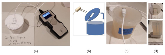 Measurements were conducted on each phantom over 10 days to investigate the possible changes occurring in the mixtures with time: fast changes were observed for the first four days and then, in the second week, stabilization of the values was assessed. The phantoms were stored in sealed containers; the lid of each container was replaced with a dedicated home-made fixture able to held in place the sensors during the measurements, as shown in Figure 1. Three to five measurements were conducted on each phantom per day.