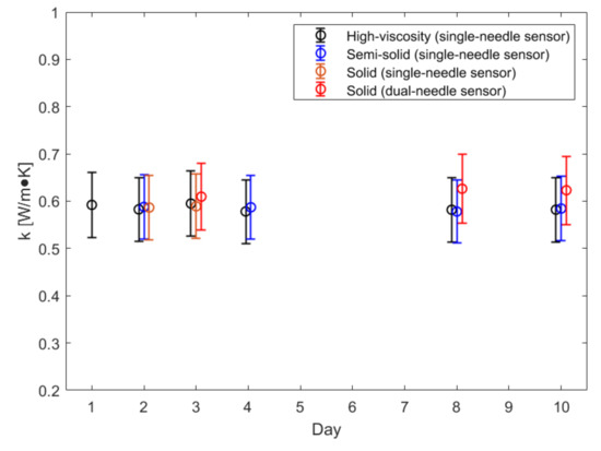 Thermal conductivity of the high-viscosity, semi-solid and solid phantom measured with the single-needle sensor and with the dual-needle sensor over time.