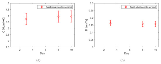 The measurements conducted on the phantoms over time (10 days) are illustrated in Figure 2 and Figure 3. In the figures, the average value measured each day is reported together with its associated uncertainty, calculated as in [16], i.e., accounting for the data variability and the device accuracy (10%). In Figure 2, the thermal conductivity of the three phantoms is shown. In Figure 3, the volumetric heat capacity and the thermal diffusivity of the solid phantom measured with the dual-needle sensor are shown.