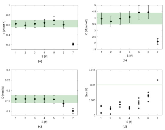 The sensitivity study conducted on the solid phantom showed that the dual-needle sensor (SH-3) can correctly measure (within the 10% accuracy of the device indicated by the green bar in Figure 4) the thermal properties of a test sample smaller than the one specified by the manufacturer (i.e. 15 mm per side for a total of about 25 cm3). Reducing the radial dimension of the sample from 15 mm (S2 in Figure 4) to 8 mm per side (S4 in Figure 4), the device performances are secured; lack of accuracy can be observed between 8 mm and 4 mm (S6 in Figure 4), but the values measured remain within the uncertainty of the bulk data (S1 in Figure 4). When a minimum of 4 mm of material parallel to the sensor in all directions is not guaranteed (S7 in Figure 4), the sensor is not able to measure correctly. These results are also confirmed by Figure 4d, where we can observe how well the device’s least square model fits the data. It is worth to notice that reducing the dimensions of the sample, a longer time (up to 30 min) before performing the first measurement should be waited to allow the system to equilibrate. Last, the sample should always entirely cover the length of the sensor to ensure correct measurements, as inferred by the sensor measuring mechanism. Such conclusion has been experimentally confirmed: a 20 mm long solid phantom sample has been measured, and thermal conductivity and volumetric heat capacity values 30% lower (beyond the device accuracy) than in the bulk case (S1) have been obtained (k = 0.42 ± 0.05 Wm−1K−1, C = 2.66 ± 0.31 MJm−3K−1).