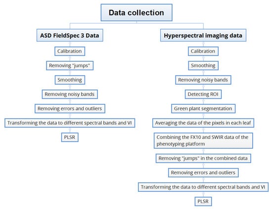 The data collected by the individual cameras and spectrometer were processed separately in Python 3.6 [19]. The reflectance data were pre-processed and transformed into different spectral bands with different band centres and bandwidths. Then the transformed data were used to train and validate partial least square regression (PLSR) models for estimating N content. The workflow is shown in Figure 1 and detailed below.