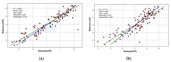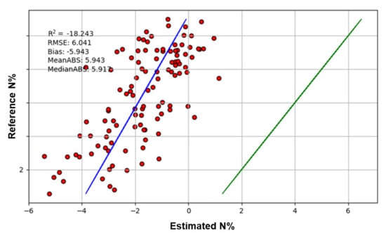 As the application of hyperspectral imaging increases, it would be beneficial to apply previously developed models using different sensors without the need to repeat extensive modelling work. To the authors’ knowledge, there are few reports where previously trained models of different sensors have been re-used. Here, we applied the model developed by the spectrometer data unaffected by leaf geometry to hyperspectral images. Unfortunately, the spectrometer model did not show promise for cross-sensor application. The validation has a large bias of −5.94 and R2 value of −18.24 (Figure 5). However, the estimated N% values have a linear relationship with the reference values, indicating that there is potential to re-calibrate the model to improve accuracy. Cross-sensor modelling would be of future interest to allow the re-use of previously established models.