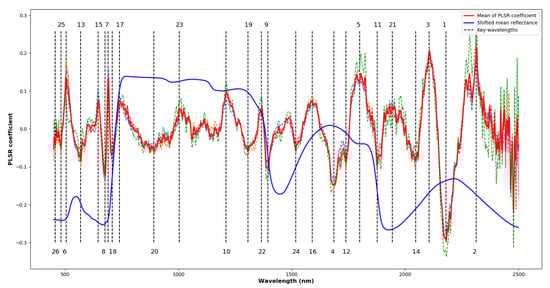 The PLSR coefficients and the key-wavelengths identified. The dotted curves in random colours are the values of the PLSR coefficients in the different folds of validation. The red curve is the average values of the PLSR coefficients in cross-validation and the dotted lines with numbers mark the locations and order of contribution of the key-wavelengths. The vertically shifted average reflectance is plotted in blue.