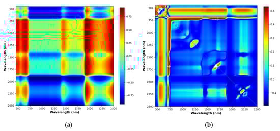 NDVI and R2 matrices. The different colour indicating the different values of NDVI or R2. (a) An NDVI matrix showing all possible wavelength combinations of a reflectance data from the ASD FieldSepc 3. (b) The R2 matrix of NDVI for validating the PLSR models.