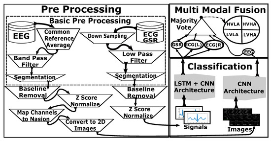 The three main components of the proposed algorithm are pre-processing, classification, and multi-modal fusion. First, all physiological signals are required to be pre-processed before their use in neural network architecture [56]. EEG is quite different from other peripheral signals in terms of the number of channels, frequency, and amplitude. Therefore, the sequence of steps applied to the EEG is generally represented in parallel to the sequence of steps applied for other modalities before multi-modal fusion. Figure 2 represents a general block diagram of all the steps applied in this study. The following subsections represent a detailed description of these steps applied in the proposed methodology.