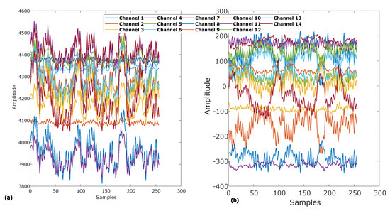 Now each of the 14 EEG channels with length l are subtracted from the computed common average as described in Equation (2) to obtain EEG signals with averaged to a common reference. The results of basic EEG pre-processing are depicted in Figure 3. Figure 3a represents raw EEG signals of all the 14 channels and Figure 3b represents all channels of EEG signals after averaged to a common reference.
