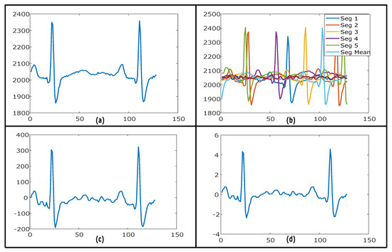 (a) ECG signal after basic pre-processing. (b) Five segments of ECG baseline activity with computed mean signal. (c) ECG signal (left channel) 1 s segment of emotional activity after removing mean of baseline activity. (d) After Z-score normalization.