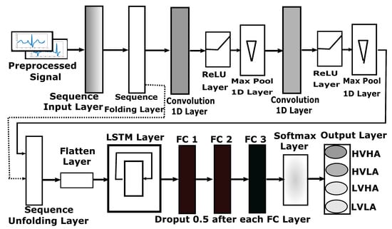 The detailed design of DNN architecture for ECG and GSR-based sequence data is illustrated in Figure 7. This architecture accepts sequence inputs of size 1 × 128 in its sequence input layer. After the sequence folding layer, two sets of 1D convolutional layers were added. First convolutional layer contains 16 filters of size 3 × 1, while second convolutional layer contains 32 filters of size 3 × 1. Each of these convolutional layers is followed by the ReLU layer and 1D max-pooling layer of size 2 × 1 with a stride of one. After max pooling, sequences are unfolded based on mini-batch size, and flatten layer was applied to get a feature vector. This feature vector is now passed through the LSTM layer with 128 hidden units, state activation function of and gate activation function of is used. LSTM layer is then followed by a series of three fully connected layers of size 256 for FC1, 128 for FC2, and a size of 4 for FC3. Each fully connected layer is followed by a dropout layer of 0.5, discarding 50% of random features to avoid over-training of sequence data from LSTM. The last FC layer after dropout is connected to the classification output layer through the SoftMax layer for the classification of HVHA, HVLA, LVHA, and LVLA classes of emotion.