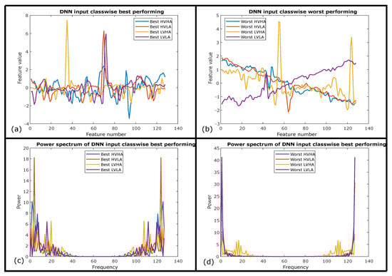 It is also interesting to investigate the spectral signature of ECG signals and compared it with GSR signals to elaborate on the significance of ECG results as compared to GSR results for the same deep neural network architecture. Best and worst-performing ECG instances from test data of AMIGOS, based on their prediction probabilities were selected for four classes individually are presented in Figure 8a,b respectively. Signals of all classes except LVHA are baseline shifted with high noise content hiding the actual shape of an ECG signal results in its worst performance for the use of emotion elicitation. The power spectrum comparison for four classes of best and worst of these signals is presented in Figure 8c,d, respectively. Figure 8c depicts higher inter-class spectral variability of best-performing signals as compared to lower inter-class spectral variability of worst signals except for LVHA in Figure 8d.