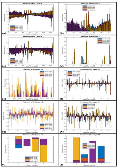 Figure 11a–h also describe the hidden feature representations evolved through subsequent layers for worst ECG instances for the same 1D-CNN + LSTM architecture. It can be observed that the inter-class variability improves significantly after LSTM and for deep layers of architectures such as represented in Figure 11g,h. However, it is also evident that the overall inter-class variability enhancement for emotion classification is much smaller as compared to the improvement found for best-performing ECG instances. Signals performed worst primarily since these signals are inherited with strong input noise, which is unable to be removed through pre-processing steps performed before introducing the signals to DNN.