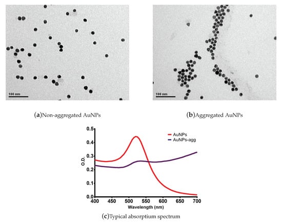 Aggregation of gold nanoparticles (AuNPs) and the corresponding absorption spectrum. (a) Microscopic images of non-aggregated AuNPs. (b) Microscopic images of aggregated AuNPs. These images where obtained using transmission electron microscopy for visual and morphological characterization (JEOL JEM 1200EX II Microscope, Electron Microscopy Laboratory, Universidad de Concepción). (c) Absorption spectrum of aggregated and non aggregated AuNPs. When the aggregation occurs, it produces a shift in the intensity peak of the absorption spectrum with the corresponding colorimetric change.