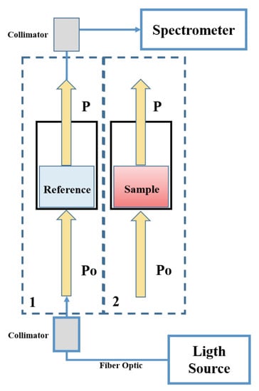 Block diagram of the optical data acquisition system. Firstly, a reference well is measured to estimate the aggregated spectrum of the container, the water and the dissolved NBS. The reference data are stored by the developed software. Secondly, each sample is measured in the same way and the NBS absorbance is obtained by subtracting the reference from the sample absorbance.