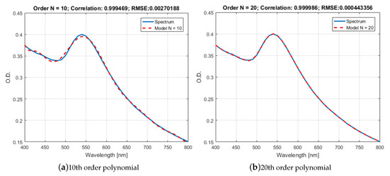Adjustment of the measured absorption spectrum by means of Legendre functions of the first type. As the number of basis functions is increased, the better the fit of the approximation . The approximation is shown with (a) ten basis functions and (b) twenty basis functions.