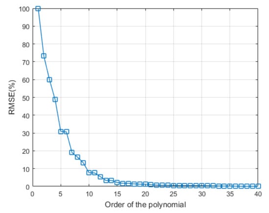 Root-mean-square error (RMSE) of the fit between the measured absorption spectrum and the approximation made with the Legendre functions for Kanamycin. We require basis functions to ensure an RMSE below 1%.
