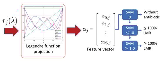 For the purpose of this work, we employed support-vector machine (SVM) classifiers to determine the presence and the level of antibiotics concentration for a given spectrum. According to the Chilean regulation, we defined three classifiers: one to determine whether the sample has antibiotic or not (SVM 0), one to determine if the sample has antibiotic with a concentration below the MRL (SVM ≤ 1.0) and another to determine whether the sample has a concentration of antibiotic above the MRL (SVM ≥ 1.0). In Figure 6, one can see the classification scheme. The measured spectrum with unknown antibiotic concentration enters the algorithm from which the expansion coefficients are computed. These coefficients are used to infer the concentration among the aforementioned classes: the sample has no antibiotic, the sample has antibiotic with concentration below or above the MRL.