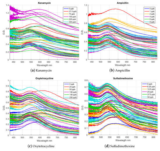 Novel NBS based on gold nanoparticles (AuNPs) for antibiotic detection in milk have been previously reported [9,17,18]. A successful multidetection in milk of the antibiotics Sulfadimethoxine, Kanamycin and adenosine was also reported using an AuNP-aptamer biosensor with visual colorimetric detection to determine the antibiotics at concentrations of 100–500 ng/mL [19]. In general, state-of-the-art research on biosensors for antibiotic detection calculate the concentration based on simple linear regressions of calibration curves. However, the processing and analysis of spectral signals using advanced mathematical methods, such as classification algorithms, are powerful tools that can be implemented to improve detection and analytical parameters of optical NBS [20,21].