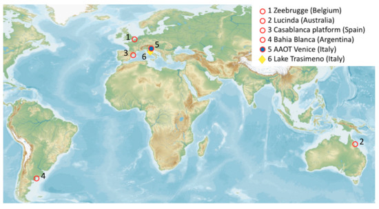 Figure 1 shows the geographic distribution of sites (the coordinates are provided in Table 2), providing in situ measures to be compared to PRISMA. The sites represent a rather wide range of water types and trophic conditions but also atmospheric turbidity. In particular: (1) the Zeebrugge site in the North Sea is representative of turbid nearshore waters [40]; (2) the Lucinda site is located in tropical coastal waters in Eastern Australia, dominated by non-algal particulates and CDOM [41,42]; (3) the Casablanca site in the Western Mediterranean Sea is representative of open ocean chlorophyll-a dominated waters [43]; (4) the Bahia Blanca site in the southern Atlantic coast is representative of high suspended loads induced by widespread erosion and strong tidal currents [44]; (5) the Acqua Alta Oceanographic Tower (AAOT) of Venice in the northern Adriatic Sea is representative of moderately sediment dominated waters [45,46]; (6) finally, Lake Trasimeno has shallow turbid waters with recurrent sediment resuspension and moderate to high bloom of phytoplankton, including cyanobacteria species [47].