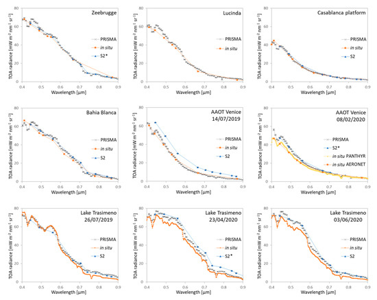 TOA radiances measured by PRISMA and Sentinel-2/MSI (S2), and simulated with 6SV (labelled as in situ). Symbol * means that Sentinel-2 and PRISMA overpasses occurred on the same day.