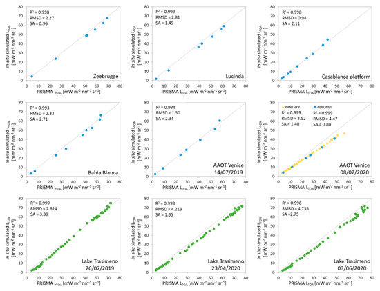 The image-by-image comparison of PRISMA with 6SV simulations (Figure 3) shows a R2 of about 0.99 indicating a strong linear correlation in the VNIR range. RMSDs is between 0.98 [mW m−2 sr−1 nm−1] for the Casablanca platform site and 4.76 [mW m−2 sr−1 nm−1] for the Lake Trasimeno site (03/06/2020) hence indicating an overall good correspondence between the two set of data. Metrics also show a good agreement in terms of spectral shape, with SA ranging from 0.96 [°] for the Zeebrugge to 2.71 [°] for Bahia Blanca with simulated data obtained from AERONET-OC. In AAOT Venice site (08/02/2020) the results obtained with PANTHYR are comparable to the outcomes of AERONET-OC, even if some difference is present due to the different characteristics of data set such as the number of bands available to compute the metrics.