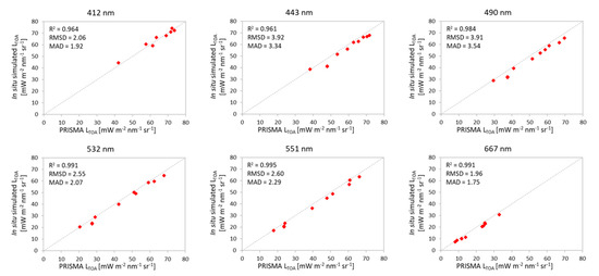 For the match-up analysis, the TOA radiances are derived from imagery data by computing the average value and standard deviation of PRISMA and MSI data corresponding to a square box of 3 × 3 pixels defined over the in situ measurements stations. Common descriptive statistical metrics (e.g., [62]) such as root mean square difference (RMSD), mean absolute difference (MAD), spectral angle (SA), and the square of the coefficient of correlation (R2) (Table 3) and scatterplots are used for the comparison. A good agreement between the datasets is achieved when R2 is close to 1, and bias and the other parameters are close to 0.