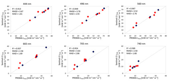 Scatterplots of TOA radiances from PRISMA (x-axis) vs. Sentinel-2/MSI (y-axis) for the eight match-ups (corresponding to five sites, i.e., all save Lucinda). Diamonds in blue highlight when PRISMA and Sentinel-2/MSI were acquired on the same day, diamonds in red stand for +/− 1 day mismatch.