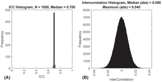 Using this method, we can create features which are normally distributed, that have specified ICCs, with as many subjects and sessions as we desire. These features all have mean = 0 and SD = 1. These features are generally independent, but there are some small intercorrelations between features due to chance. To illustrate the approach, we generated data for 10,000 subjects, 1000 features and 2 occasions with . Figure 1A shows a histogram of the resulting empirical ICCs. Figure 1B shows a histogram of the resulting inter-feature correlations.