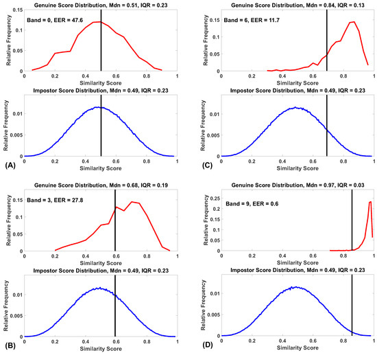 Similarity score distributions for Bands 0, 3, 6 and 9. (A) Distributions for Band 0 (ICC from 0.0 to 0.1). (B) Distributions for Band 3 (ICC from 0.3 to 0.4). (C) Distributions for Band 6 (ICC from 0.6 to 0.7). (D) Distributions for Band 9 (ICC from 0.9 to 1.0). Frequency is expressed as a proportion of all values. Mdn = median, IQR = interquartile range. Vertical black lines represent the threshold at which EER was achieved. For each band, 20 features were chosen randomly.