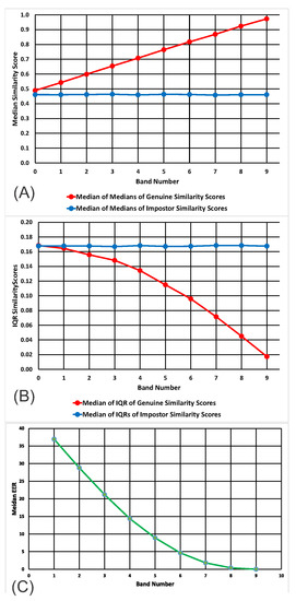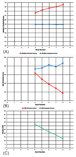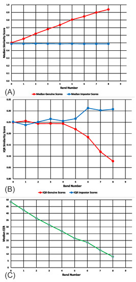 Medians and IQRs of genuine and impostor similarity scores across bands. (A) Medians for SBA real dataset. (B) IQRs for SBA real dataset. (C) Median EERs. Ranges for the values in this figure can be found in Appendix B, Table A3, Table A4 and Table A5.