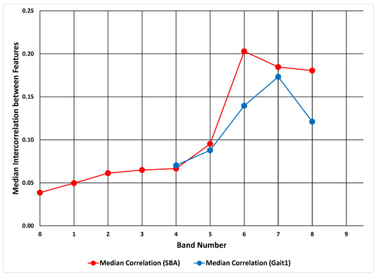 For both the SBA and the Gait1 datasets, the pattern of results was similar to that obtained from the synthetic data. In all cases, the median of the distribution of genuine similarity scores increased linearly with ICC Band (Figure 3A, Figure 4A and Figure 5A, red lines). In all cases, the median of the distribution of imposter similarity scores was mostly flat and unrelated to ICC Band (Figure 3A, Figure 4A and Figure 5A, blue lines). In all cases, the IQR of the distribution of genuine similarity scores decreased with increasing ICC Band (Figure 3B, Figure 4B and Figure 5B, red lines). However, there was one obvious difference between the results for the datasets and the results for synthetic features. For our synthetic data, the IQR of the distribution of imposter scores was flat and unrelated to ICC band whereas for both real feature datasets, there was an increase in the IQR of the distribution of imposter scores as the ICCs increased (Figure 3B, Figure 4B and Figure 5B, blue lines).