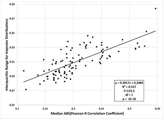 To test if the IQR of the impostor distribution was related to the median intercorrelation between features in a dataset, we first combined the features from SBA Band 6 and Band 7. This yielded a combined dataset with 38 features. For 100 iterations, we randomly sampled, without replacement, 10 of the 38 features, computed the median Pearson r correlation coefficient (absolute value), and also computed the IQR of the impostor similarity scores for the random subset of features (Figure 7). From this figure we can see that the IQR of the impostor distribution increased linearly with increasing intercorrelation among features.