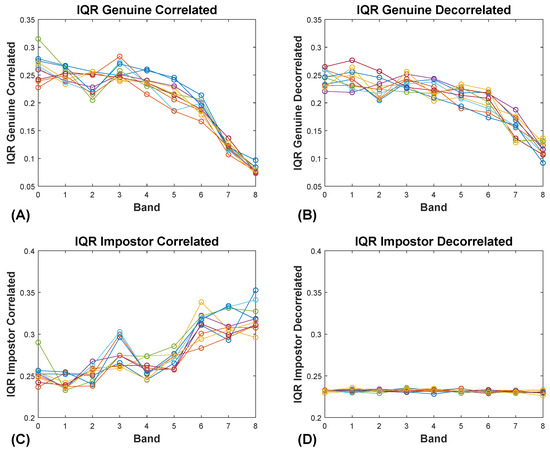 In Figure 8A, we see the relationship between ICC band and the IQR of the genuine similarity scores for the original (intercorrelated) SBA dataset. For all the plots in Figure 8, there are 10 lines, each representing a different random selection of 10 of 19 features in each SBA band. In Figure 8B, we see the same data as in Figure 8A after the features within each band have been decorrelated. In Figure 8C, we present the relationship between ICC band and the IQR of the impostor distributions with the raw, intercorrelated data. In Figure 8D we see the same data as in Figure 8C, after the features in each band have been decorrelated. The fact that removing the intercorrelations from the real data reproduces the findings of the synthetic data confirms that this is in fact the explanation for the observed difference.