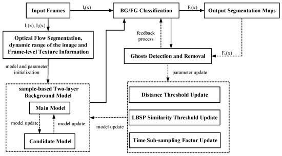 Generally, ghosts can occur in the following two cases: (1) The foreground object that remains motionless for a long time is incorporated into the background. Later on, the foreground object is removed, and the initial position of the object is incorrectly detected as foreground; and (2) when an object that exists in the first frame begins to move after a few frames, the newly revealed background called “ghosts” is detected. Ghosts do not correspond to any real object in practice and have to be discarded. In this paper, we proposed an effective method of ghost detection and removal based on the SuBSENSE framework []. First of all, an adaptive sample-based two-layer background model, main background model, and candidate background model were proposed to remove the first kind of ghosts. The main model aimed to store the adaptive background samples. In the model update, the background samples replaced in the main model were stored in the candidate model, that is, the background samples were not actually deleted. Doing can extend the lifespan of the background samples, removing the periodic motion background and the ghosts of intermittent moving objects. Then, we utilized the histogram similarity of moving areas between the first frame and the ghost formation frame to deal with the second kind of ghosts. Furthermore, in order to make the segmentation thresholds adapt to the analyzed scenarios, the distance threshold was initialized according to background dynamics, dynamic range, and texture complexity of a scenario, and then it was updated automatically in the subsequent frames by combining spatiotemporal local information. The similarity threshold of local binary similarity pattern (LBSP) feature was computed based on the mean squared error of the background samples sets. The improved thresholds not only effectively detected camouflaged objects in low-contrast regions, but also suppressed dynamic background in high-contrast regions. In addition, since there was often a clear boundary between background and foreground area, the time subsampling factor increased in the edge to slow down the neighborhood diffusion of the background samples, retaining the static foreground for a long time. For the sake of convenience in writing, we use the abbreviation “GhostDeReBS” to represent our proposed method in the paper. An overview of GhostDeReBS’ framework is shown in Figure 1.