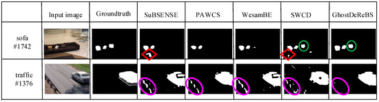 Figure 2 shows the detection results of five methods, respectively, on the “sofa” #1742 and “traffic” #1376 frame from the CDnet 2014 dataset []. The description of this dataset is postponed to Section 3. The #1742 frame in the sofa sequence included three objects: A light-yellow box, white plastic bag, and briefcase. The light-yellow box was a static object on the floor which was then moved onto the sofa. A ghost was left on the floor (marked using red ◇) in the detection results of SuBSENSE [] and SWCD []. However, our two-layer not only suppressed ghosts, but also detected camouflaged static foreground object (marked using green 〇 in Figure 2) because of the adaptive distance and LBSP threshold in Section 2.4. Moreover, the periodic motion background often happened because of the camera jitter, as shown in the traffic sequence in Figure 2, and a lot of false positives (i.e., marked using purple 〇 in Figure 2) occurred. Compared with SuBSENSE, PAWCS [], WeSamBE [], and SWCD, our model effectively removed these false positive detection. The reason is that the periodic background motion made the background samples appear intermittently. The earlier background samples were stored in the candidate background model in our proposed method. When Equation (11) was executed, the dynamic background could be suppressed. However, these earlier samples could have been deleted in the other methods, making the current observation unmatched with background model.